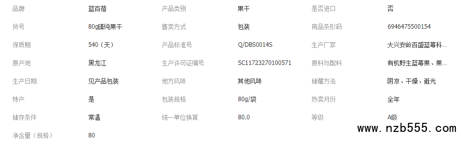 詳細(xì)信息 ![]() 品名:藍(lán)莓果干 凈含量 :80g 配料 :有機(jī)野生藍(lán)莓果、果葡糖漿、橄欖油 產(chǎn)品標(biāo)準(zhǔn)號(hào) :Q/DBS 0014S 條碼 :6946475500154 生產(chǎn)許可證號(hào):SC11723270100571 保質(zhì)期:18個(gè)月 生產(chǎn)日期:見(jiàn)封口 貯存條件:陰涼、干燥、避光 食用方法:直接食用