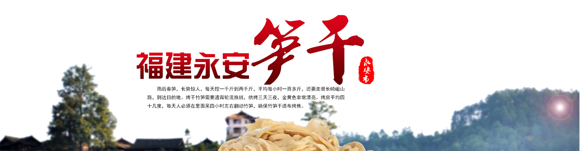 永安市農(nóng)聯(lián)筍干農(nóng)民專業(yè)合作社座落于有著中國十大竹之鄉(xiāng),中國優(yōu)秀的旅游城市,中國十大魅力城市——永安市。永安,中國筍竹之鄉(xiāng),是我國大多數(shù)竹子生長的適宜中心產(chǎn)區(qū),永安,竹子的故鄉(xiāng),這里有享譽海內(nèi)外的“閩西八大干”之永安筍干,其古老的傳統(tǒng)生產(chǎn)工藝已有悠久的歷史;有建于明朝年間的筍業(yè)同業(yè)公會舊址——“筍幫公棧”。 滿目青山綠水,放眼竹海,豐富的毛竹資源,名列全國的生態(tài)環(huán)境和歷史悠久的生產(chǎn)工藝的傳承造就了永安筍干的優(yōu)良品質。 農(nóng)聯(lián)筍干專業(yè)合作社,取永安本土竹筍作為原料,加之本社農(nóng)戶注重傳統(tǒng)的工藝的傳承以及改進, 既保存好傳統(tǒng)工藝制作出的筍干獨特風味,也提高了筍干的產(chǎn)量。使生產(chǎn)出的肉質肥厚、色澤金黃、筍花明顯、濃郁的原汁原味、特色香味及嫩、脆等獨具一格的品質,深受廣大海內(nèi)外消費者的好評。 [詳細介紹]