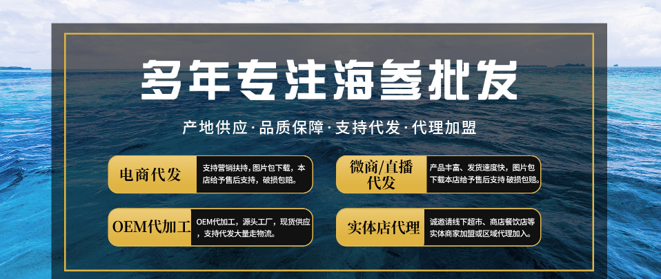 樂陶海參起源于山東煙臺沿海漁村,傳承父輩對海參的傳統(tǒng)捕撈,加工,銷售至今。隨海參需求市場對品質(zhì)要求不斷提高,樂陶海參的品種工藝也與時俱進,多樣化。現(xiàn)主營國內(nèi)外淡干海參、國標特級純淡、加拿大紅極參、即食、拉缸鹽暢銷市場。公司與多家零售商和代理商建立了長期穩(wěn)定的合作關(guān)系。并承接客戶定制、代加工。公司秉承重信用、守合同、保質(zhì)量,做優(yōu)質(zhì)海參供貨商為理念,以廠貨源頭、微利走量為宗旨,贏得更多多元化渠道代理商,一起合作共贏。 [