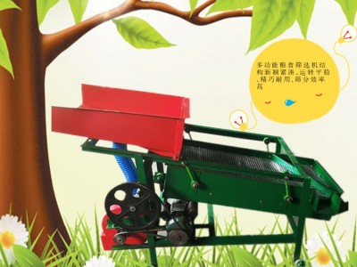 本機為二層篩網,先經過進料口處風機抽風,直接抽走重量輕的雜葉或麥秸稈,上層篩的初次篩分再把大雜清理過,好的糧食(種子)直接落到下層篩網上,下層篩網會把糧食(種子)中的小雜.小石子.有缺陷的糧食(種子)直接漏掉,完好的糧食(種子)會從出料口篩分出來。該小型清糧機解決了揚場機的功能單一,不能有效去除石子.土塊的缺陷,更能為清理、凈選糧食(種子)帶來滿意的效果。該機有占地小,移動方便,便以維修,除塵除雜效率明顯,能耗低,使用簡便等優(yōu)點。
