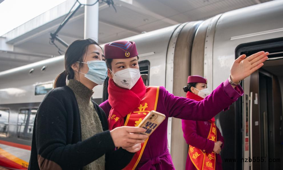 1月17日,在重慶北站,G8612次“共青團(tuán)號(hào)”列車(chē)工作人員為旅客提供幫助。新華社記者 唐奕 攝