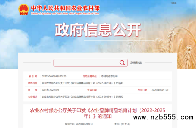 為深入貫徹中央農(nóng)村工作會議、中央一號文件精神,加快農(nóng)業(yè)品牌打造,夯實基礎(chǔ)支撐,加強營銷推廣,提升服務(wù)能力,促進消費升級,全面提升農(nóng)業(yè)品牌競爭力影響力帶動力,我部決定實施農(nóng)業(yè)品牌精品培育計劃,為全面推進鄉(xiāng)村振興、加快農(nóng)業(yè)農(nóng)村現(xiàn)代化發(fā)展提供支撐。現(xiàn)將《農(nóng)業(yè)品牌精品培育計劃(2022—2025年)》印發(fā)你們,請結(jié)合實際,認真組織實施,并于每年12月底前報送工作總結(jié)和重點培育的農(nóng)業(yè)品牌發(fā)展情況至農(nóng)業(yè)農(nóng)村部市場與信息化司。
