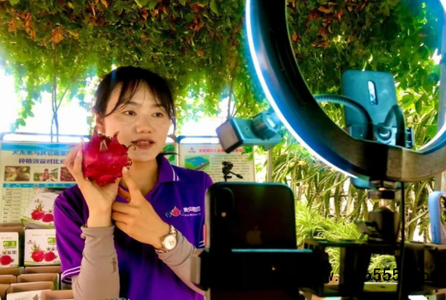 7月初,在楊凌青皮她園火龍果基地,一壟壟整齊的火龍果樹綿延至視線盡頭,有的果枝剛長出新芽,有的已掛出果實(shí)。工人們?cè)谶M(jìn)行剪枝、修芽等管護(hù)工作,基地負(fù)責(zé)人王艷正端坐在手機(jī)屏幕前,對(duì)著鏡頭直播。