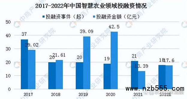 另外,隨著政策對智慧農(nóng)業(yè)領(lǐng)域的大量傾斜,眾多投資人開始“上山下鄉(xiāng)”,試圖從中尋找新的增長機會。自2017年以來,智慧農(nóng)業(yè)投融資事件呈現(xiàn)下降的趨勢,但是投融資金額呈現(xiàn)增長的趨勢。2021年中國智慧農(nóng)業(yè)領(lǐng)域投融資事件21起,投融資金額13.39億元。預(yù)計2022年智慧農(nóng)業(yè)投融資事件18起,投融資金額將達(dá)17.6億元。