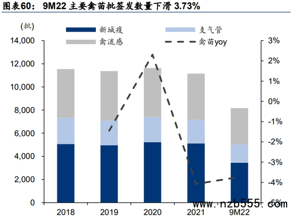 豬苗:今年上半年受限于生豬價(jià)格的低迷,養(yǎng)殖戶用苗積極性欠佳。根據(jù)國(guó)家獸藥數(shù)據(jù)庫(kù), 整個(gè)上半年口蹄疫、豬細(xì)小、豬瘟、藍(lán)耳病、腹瀉、圓環(huán)等主要豬用疫苗批簽發(fā)數(shù)量均出 現(xiàn)下降,上半年批簽發(fā)總數(shù)量同比-17%。進(jìn)入下半年,隨著豬價(jià)大幅上漲,養(yǎng)殖戶盈利轉(zhuǎn) 好,相應(yīng)帶動(dòng)了用苗積極性與補(bǔ)欄意愿,因此豬苗銷售邊際回暖。整體看,9M22 主要豬苗 批簽發(fā)數(shù)量同比增速為-3.67%,22Q3 主要豬苗批簽發(fā)數(shù)量同比增長(zhǎng) 29%。 禽苗:今年禽養(yǎng)殖整體盈利情況不佳,養(yǎng)殖戶補(bǔ)欄積極性差,拖累禽苗銷售增速。據(jù)國(guó)家 獸藥數(shù)據(jù)庫(kù),9M22 新城疫、支氣管、禽流感批簽發(fā)數(shù)量分別為 3452、1560、3162,同比 分別為-11.40%、3.11%、2.60%。整體看,9M22 主要禽苗批簽發(fā)數(shù)量下滑 3.73%。