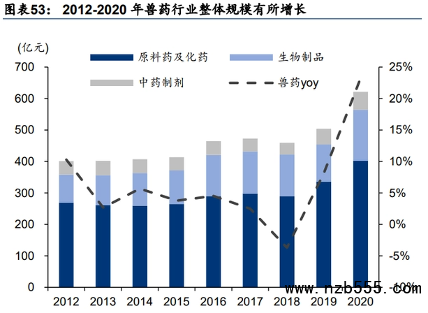 從整個(gè)獸藥行業(yè)(包括原料藥化藥、生物制品即疫苗、中藥制劑)來看,2012-2020 年我 國(guó)獸藥行業(yè)銷售規(guī)模從 401 億元增長(zhǎng)到 621 億元,CAGR 為 5.6%。其中,2020 年原料藥 及化藥銷售規(guī)模 401.78 億元,占 65%,生物制品 162.36 億元,占比 26%,中藥制劑 56.81 億元,占比 9%。