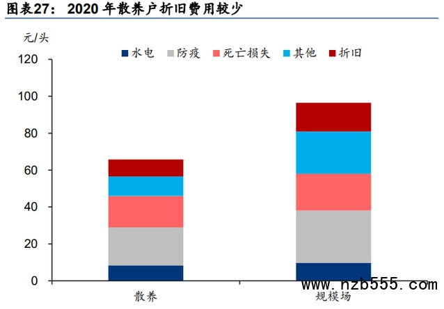 散戶成本高,更容易被出清。歷史上,由于散戶資金量較小,抗風(fēng)險(xiǎn)能力較弱,而成本又 較高,因此規(guī)模化進(jìn)程一直持續(xù),且歷次產(chǎn)能出清大部分情況下均以散戶產(chǎn)能退出。根據(jù) Wind,2020 年規(guī)模場(chǎng)養(yǎng)殖成本相比散養(yǎng)戶有優(yōu)勢(shì),散戶成本為 2913.65 元/頭,規(guī)模戶為 2699.42 元/頭。分拆成本看,規(guī)模場(chǎng)物質(zhì)及服務(wù)費(fèi)用相比散戶更高,土地費(fèi)用基本持平, 降成本顯著的是人工費(fèi)用,體現(xiàn)了集約化的特點(diǎn)。散戶由于缺少規(guī)模效應(yīng),頭均人工費(fèi)用 占比較大,比規(guī)模戶高 350 元/頭。
