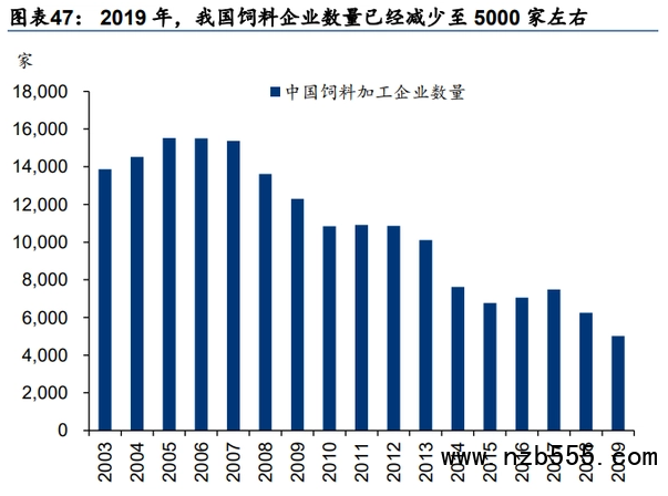 整合縱深推進(jìn),飼料行業(yè)集中度呈上升趨勢(shì)。據(jù)中國(guó)飼料工業(yè)協(xié)會(huì)數(shù)據(jù),2021 年全國(guó) 10 萬噸以上規(guī)模飼料生產(chǎn)廠 957 家,比上年增加 208 家;合計(jì)飼料產(chǎn)量 17707.7 萬噸,比上 年增長(zhǎng) 24.4%,在全國(guó)飼料總產(chǎn)量中的占比為 60.3%,比上年提高 7.5 個(gè)百分點(diǎn)。21 年全 國(guó)有 14 家生產(chǎn)廠年產(chǎn)量超過 50 萬噸,比上年增加 5 家。年產(chǎn)百萬噸以上規(guī)模飼料企業(yè)集 團(tuán) 39 家,比上年增加 6 家;合計(jì)飼料產(chǎn)量占全國(guó)飼料總產(chǎn)量的 59.7%,比上年提高 5.1 個(gè) 百分點(diǎn);其中有 6 家企業(yè)集團(tuán)年產(chǎn)量超過 1000 萬噸,比上年增加 3 家。 企業(yè)數(shù)量逐步減少。2006 年以來,我國(guó)飼料企業(yè)數(shù)量整體呈下降趨勢(shì),行業(yè)集中度逐步提 升。根據(jù)飼料工業(yè)協(xié)會(huì)統(tǒng)計(jì),2019 年我國(guó)飼料企業(yè)數(shù)量 5016 家,相較歷史最多的 2005 年 15518 家已經(jīng)減少了超過 2/3。