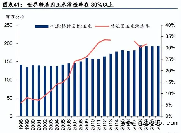 世界轉(zhuǎn)基因玉米和大豆普及率較高:從轉(zhuǎn)基因農(nóng)作物在世界上的普及程度上來看,轉(zhuǎn)基因 玉米和大豆是世界上種植面積最大的兩種轉(zhuǎn)基因農(nóng)作物,據(jù) Wind,其種植面積分別占世界 轉(zhuǎn)基因作物的 50%左右和 30%左右,其次為轉(zhuǎn)基因棉花和轉(zhuǎn)基因油菜。世界轉(zhuǎn)基因玉米滲 透率在 30%以上,轉(zhuǎn)基因大豆?jié)B透率在 80%左右。轉(zhuǎn)基因玉米和大豆在國(guó)外尤其是美國(guó)擁 有接近 30 年的種植歷史,轉(zhuǎn)基因農(nóng)作物在提升植物抗蟲性、抗藥性、抗逆性等方面有著獨(dú) 特的優(yōu)勢(shì),并且由于可以減少病蟲災(zāi)害的影響,對(duì)應(yīng)產(chǎn)量有所提升。