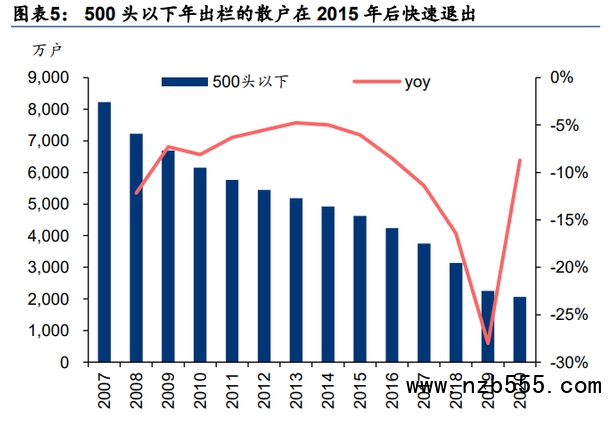 散戶數(shù)量一直在減少。根據(jù)中國(guó)畜牧獸醫(yī)年鑒,自世紀(jì)初到現(xiàn)在,500 頭以下年出欄的小 型散戶數(shù)量一直在減少,2000 年左右高達(dá) 1 億戶以上,而經(jīng)過接近 20 年的去化與整合, 2020 年 500 頭以下年出欄的小型散戶數(shù)量?jī)H有 2062 萬戶,數(shù)量減少了超過 80%。而由于 環(huán)保等因素,自 2015 年以來生豬養(yǎng)殖逐步進(jìn)入集約化,5000 頭以上年出欄的養(yǎng)殖戶數(shù)量 也在減少。
