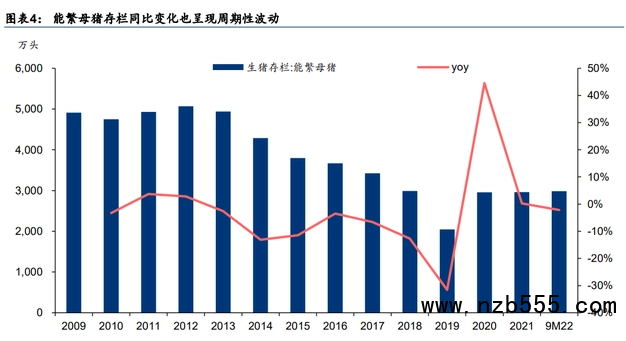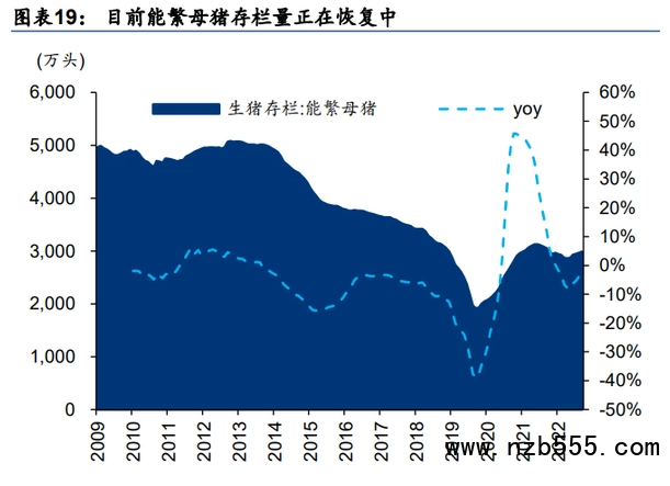 板塊估值有提升空間:在每輪周期,生豬養(yǎng)殖指數(shù)與豬價(jià)的走勢(shì)都高度相關(guān),在 2006-2010 年、2010-2014 年、2014-2018 年、2018-2022 年周期,SW 生豬養(yǎng)殖指數(shù)均在生豬價(jià)格 上升之前就已經(jīng)回升。從板塊估值的角度看,SW 生豬養(yǎng)殖 PB 估值中樞不斷抬升,2006 年最低點(diǎn)為 1.5 左右,2008 年最低點(diǎn)為 1.7,2013 年最低點(diǎn)為 1.8,2018 年最低點(diǎn)為 2.7, 2021 年最低點(diǎn)為 2.8。截至 2022 年 10 月底,SW 生豬養(yǎng)殖 PB 估值為 3.42,相較 2021 年最低點(diǎn)升高 22%左右,處于 2014 年以來的 41%分位數(shù)。隨著板塊逐步兌現(xiàn)利潤(rùn),積累 為資產(chǎn),我們認(rèn)為 SW 生豬養(yǎng)殖 PB 估值仍有進(jìn)一步提升的空間。市場(chǎng)預(yù)期在博弈什么:實(shí)際上市場(chǎng)博弈的重點(diǎn)仍然在于能繁母豬數(shù)據(jù),根據(jù)農(nóng)業(yè)部能繁母 豬同比變化與 SW 生豬養(yǎng)殖指數(shù)同比變化的對(duì)比看,其呈現(xiàn)明顯的負(fù)相關(guān)。