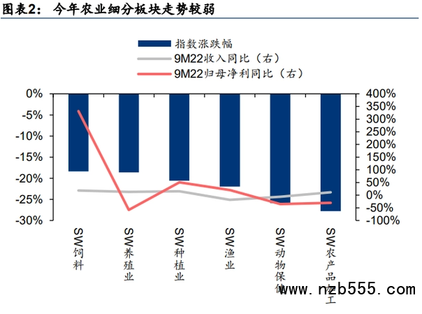 2022 年 1-10 月農(nóng)林牧漁板塊走勢(shì)較差,錄得 20%以上的跌幅,下跌的原因主要為行業(yè)預(yù) 期的轉(zhuǎn)弱,各個(gè)細(xì)分板塊均錄得 18%以上跌幅。 1)養(yǎng)殖業(yè):今年 1-10 月畜禽養(yǎng)殖錄得 19%的跌幅,主要原因是雖然虧損幅度減少,但前 三季度仍然虧損 72 億元,再加上市場(chǎng)對(duì)后續(xù)畜禽價(jià)格有所擔(dān)心,因此板塊出現(xiàn)較大幅度下 跌,前三季度收入同比上升 13%,凈利潤(rùn)減虧; 2)飼料行業(yè):飼料板塊錄得 18%的跌幅,我們認(rèn)為主要因?yàn)榘鍓K中企業(yè)大多從事養(yǎng)殖行業(yè), 雖然業(yè)績(jī)表現(xiàn)有所改善,但仍未扭轉(zhuǎn)市場(chǎng)預(yù)期,板塊前三季度收入同比上升 18%,歸母凈 利同比上升 332%; 3)動(dòng)物保健:板塊前三季度同比去年收入&凈利均有所下降,下跌原因?yàn)橛脚c估值 水平的雙降,前三季度收入同比下降 6%,歸母凈利同比下降 35%。