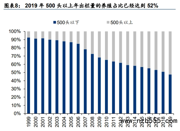 規(guī)模戶出欄量占比持續(xù)提升。大型規(guī)模養(yǎng)殖戶(企業(yè))數(shù)量一直處于快速增加的態(tài)勢(shì),2020 年最高達(dá)到了 554 戶。2019 年下降是由于非瘟疫情,生豬行業(yè)繼續(xù)整合的趨勢(shì)不變。根據(jù) 中國(guó)畜牧獸醫(yī)年鑒,2019 年 500 頭以上年出欄量的養(yǎng)殖占比已經(jīng)達(dá)到 52%,2020-2021 年為規(guī)模戶快速上量的階段,集團(tuán)企業(yè)擁有資金優(yōu)勢(shì)與種豬優(yōu)勢(shì),2021 年市占率有望繼續(xù) 提升。據(jù)農(nóng)業(yè)部新聞,2021 年全國(guó) 500 頭以上年出欄量的養(yǎng)殖占比達(dá)到 60%左右。