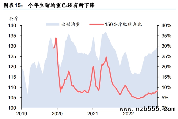 豬價(jià)出現(xiàn)首次沖高。幾個(gè)原因?qū)е?10 月份豬價(jià)沖高,1)10 月份是傳統(tǒng)的節(jié)日旺季,在中 秋和國(guó)慶假期的需求拉動(dòng)下,豬肉需求回升;2)養(yǎng)殖戶壓欄比例升高,根據(jù)涌益數(shù)據(jù),7 月份以來生豬出欄均重迅速升高,或反映了養(yǎng)殖戶持續(xù)壓欄;3)供給減少,從屠宰數(shù)據(jù)看, 9-10 月份檢測(cè)屠宰場(chǎng)屠宰量同比下降超過 40%,一方面反映高豬價(jià)下屠宰場(chǎng)收豬減緩,另 一方面也說明養(yǎng)殖端供給量有限。 從屠宰數(shù)據(jù)來看,今年 7-9 月涌益生豬屠宰量日均值為 99888 頭,相較去年同期的 154168 頭減少 35.2%。從生豬均重?cái)?shù)據(jù)來看,2022 年 6 月-2022 年 10 月,生豬出欄均重快速上 升,但 150 公斤以上肥豬占比上升緩慢。反映出養(yǎng)殖戶壓欄有節(jié)制,并非盲目壓欄,出欄 體重大部分在 140 公斤以內(nèi)的合理范疇。