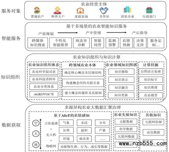 空天地AIoT全維度農(nóng)情感知、多源異構(gòu)農(nóng)業(yè)大數(shù)據(jù)匯聚治理、知識(shí)建模、知識(shí)抽取、知識(shí)融合、知識(shí)推理、跨媒體檢索、智能問(wèn)答、個(gè)性化推薦技術(shù)、決策支持等農(nóng)業(yè)智能知識(shí)服務(wù)涉及的關(guān)鍵技術(shù),逐步推動(dòng)智慧農(nóng)業(yè)的實(shí)現(xiàn)。