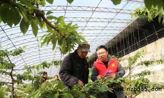 3月1日,遷安市夏官營(yíng)鎮(zhèn)櫻桃采摘園,黨員志愿者和果農(nóng)查看櫻桃長(zhǎng)勢(shì)。