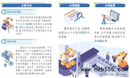 《實施意見》包括三部分內(nèi)容。第一部分總體要求,充分銜接綠色低碳高質(zhì)量發(fā)展先行區(qū)三年行動計劃、先進制造業(yè)強省行動計劃等規(guī)劃方案,明確支持實體經(jīng)濟發(fā)展的指導(dǎo)思想,提出2023年和2025年的主要目標(biāo):到2023年年底,促進實體經(jīng)濟高質(zhì)量發(fā)展的政策體系更加完善,全年新增“專精特新”中小企業(yè)1000家、高新技術(shù)企業(yè)2000家,制造業(yè)增加值、高新技術(shù)產(chǎn)業(yè)產(chǎn)值、數(shù)字經(jīng)濟核心產(chǎn)業(yè)增加值占比穩(wěn)中有升。到2025年,現(xiàn)代化產(chǎn)業(yè)體系加快構(gòu)建,產(chǎn)業(yè)基礎(chǔ)高級化、產(chǎn)業(yè)鏈現(xiàn)代化水平明顯提高,“四新”經(jīng)濟增加值占GDP比重達到40%,創(chuàng)新動力引擎更加強勁,新動能支撐作用凸顯,工業(yè)化數(shù)字化深度融合,重點行業(yè)和企業(yè)能效達到全國一流水平,培育形成一批世界級“十強產(chǎn)業(yè)”優(yōu)勢集群,先進制造業(yè)強省建設(shè)取得突破性成效。