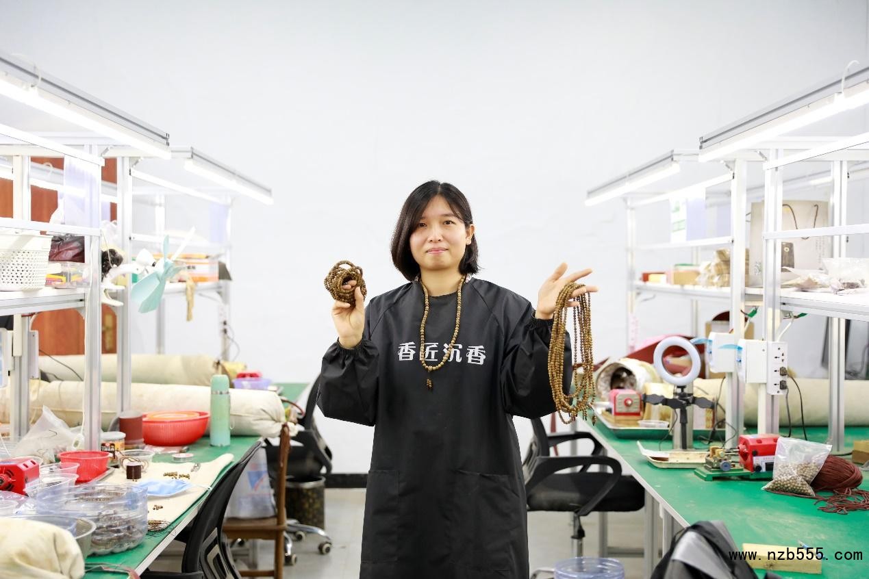 村民湯觀秋家門口就業(yè),制作沉香佛珠手串、沉香席子等。
