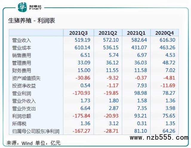 今年前三個(gè)季度,Wind生豬養(yǎng)殖細(xì)分板塊27家上市公司營收規(guī)模逐季下降,從一季度的582.64億元,下降到第三季度的519.19億元;歸母凈利潤從一季度盈利81.10億元,到第二季度虧損28.71億元,到第三季度更是虧損達(dá)167.27億元。