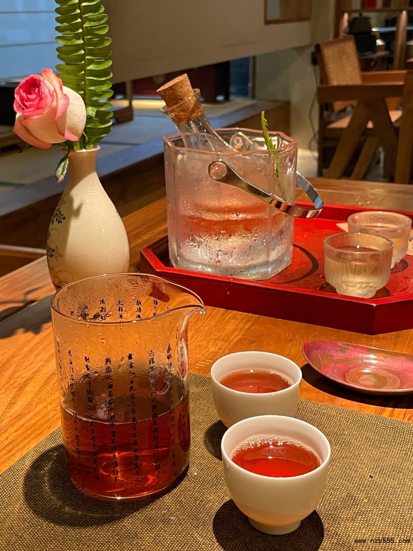茶席間擺著幾件舊物:缺角的青花小碟盛著椒鹽花生,竹編茶籮里躺著曬干的桂花,墻上老照片里穿長衫的茶客正舉杯淺笑。臨窗的老茶桌留有深淺不一的杯痕,像時光刻下的年輪。有穿對襟衫的老者推門而入,熟稔地取下墻上掛著的老銅壺自斟自飲,茶沫沾在花白胡須上也不在意,與茶藝師相視一笑,便將市井煙火氣揉進了這方茶席。